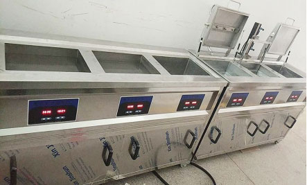 全自動超聲波清洗機是專為清洗量大、清洗要求高、使用溶劑作為清洗介質的工件設計的專用清洗設備。設備生產(chǎn)主線一般有有1-2個超聲波清洗槽、1-2個熱水漂洗槽、1-2噴淋槽、1個烘干槽等工位組成,其工作原理是利用超聲波滲透力強的機械振動沖擊工件表面并結合清洗劑的化學除油、去污作用使工件表面潔凈。
